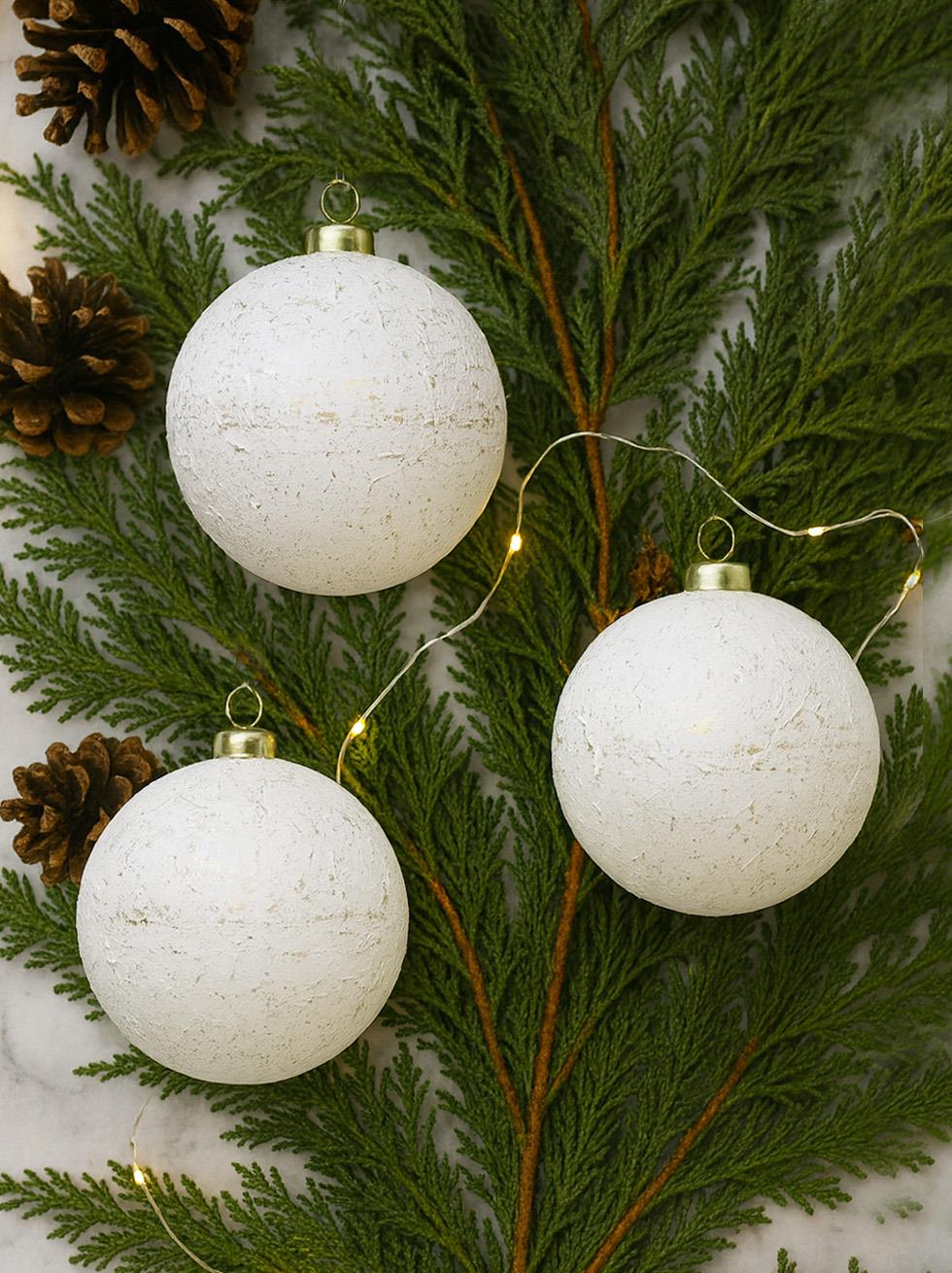 Retro eskitme beyaz yılbaşı topu yılbaşı ağacınıza klasik ve zarif bir hava katar. Altın desenleriyle öne çıkan bu dekoratif toplar, ışık yansımalarıyla parıltılı bir görünüm oluşturur.