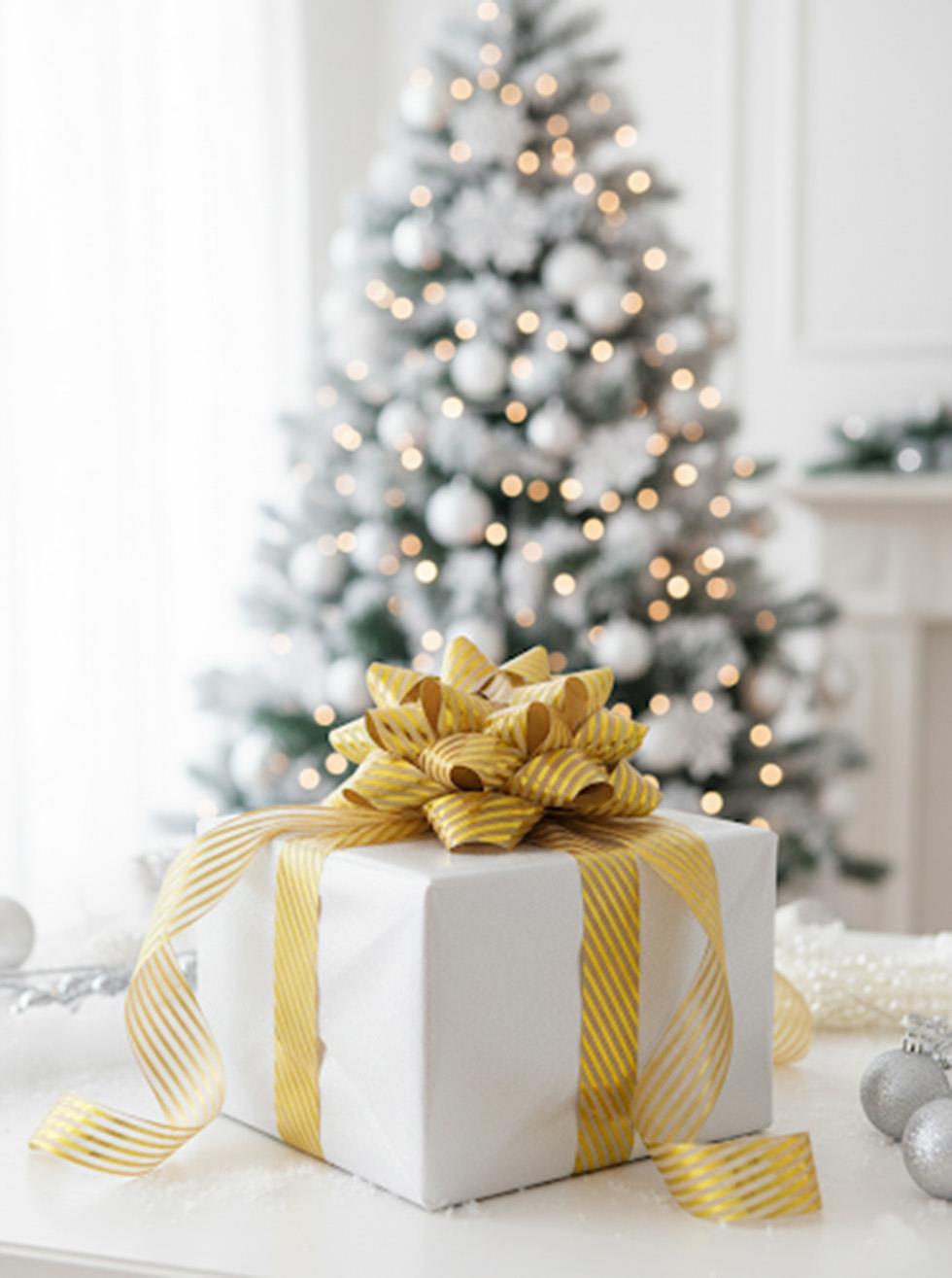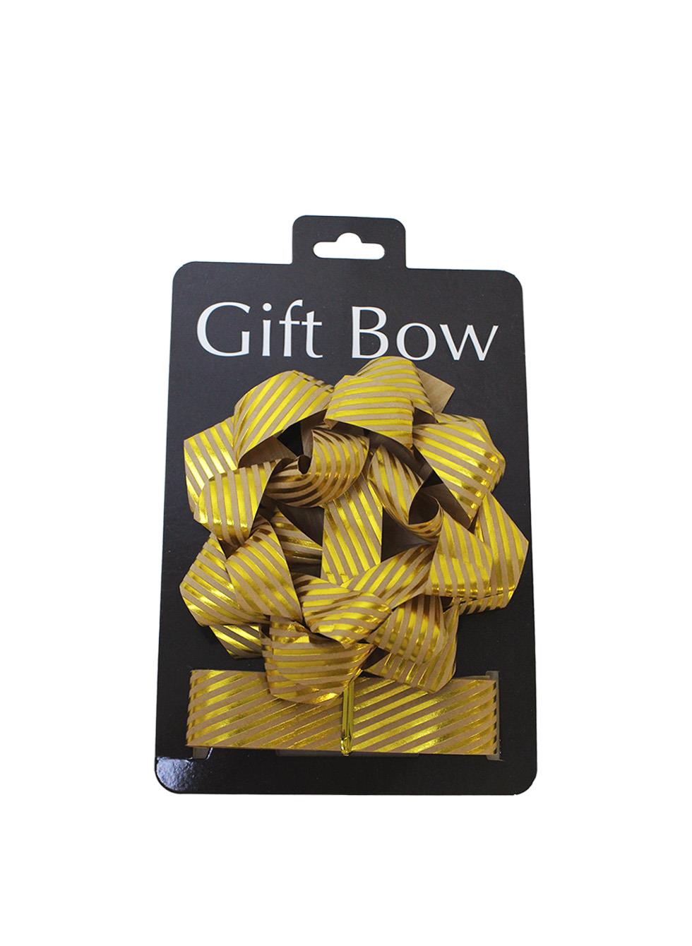 Altın rengi çizgili fiyonk ve kurdele seti, hediyelerinizi yılbaşı ruhuna uygun şekilde süslemeniz için tasarlanmıştır.