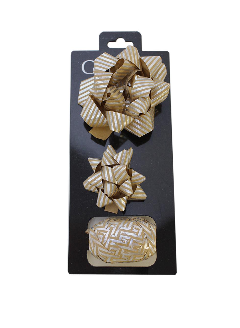 Hediye süsleme seti, çizgili desenli 2 farklı boy fiyonk ve 1 rulo kurdeleden oluşur.Ürün kağıt malzemeden üretilmiştir.