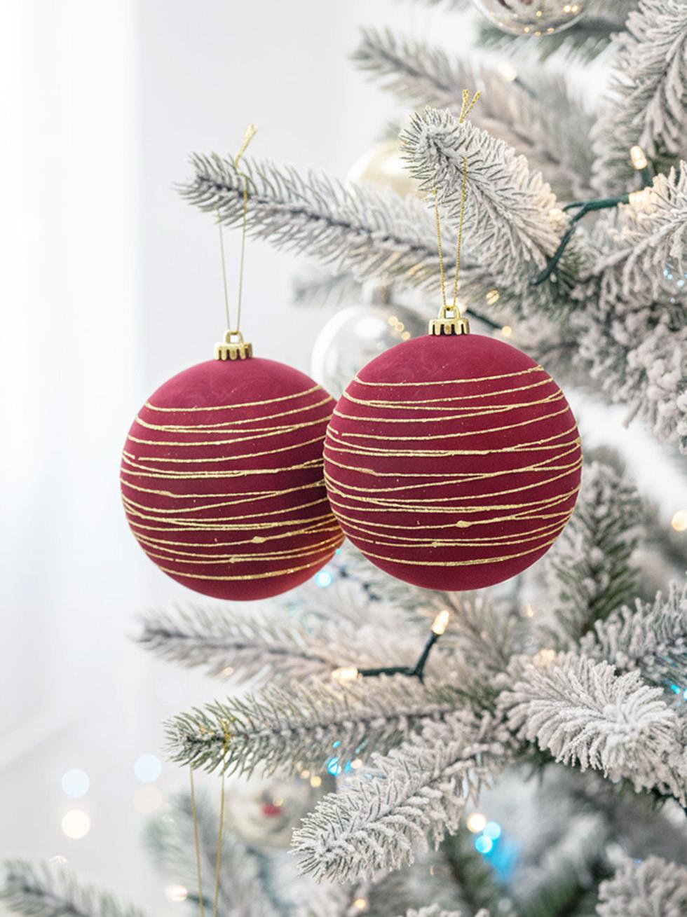 Zarif kadife dokusu ve altın simli desen detaylarıyla öne çıkan bordo kadife yılbaşı topu seti, çam ağacınıza şıklık ve modern bir hava katar.
