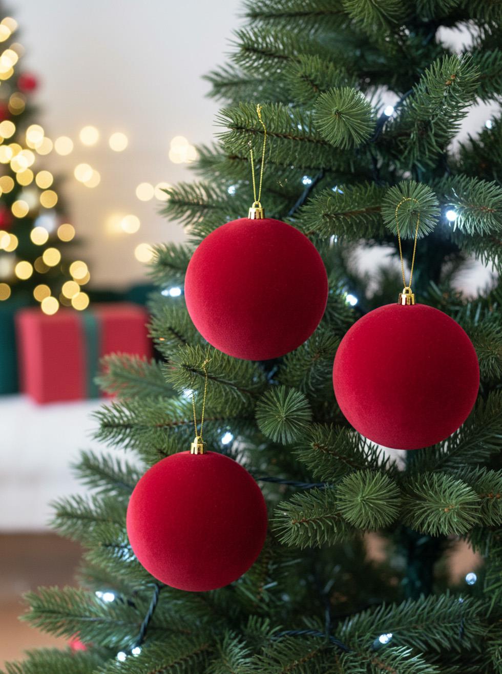 Zarif dokusuyla öne çıkan kadife yılbaşı topu, bordo rengi ve yumuşak yüzeyiyle çam ağacınıza sıcak ve lüks bir hava katar.