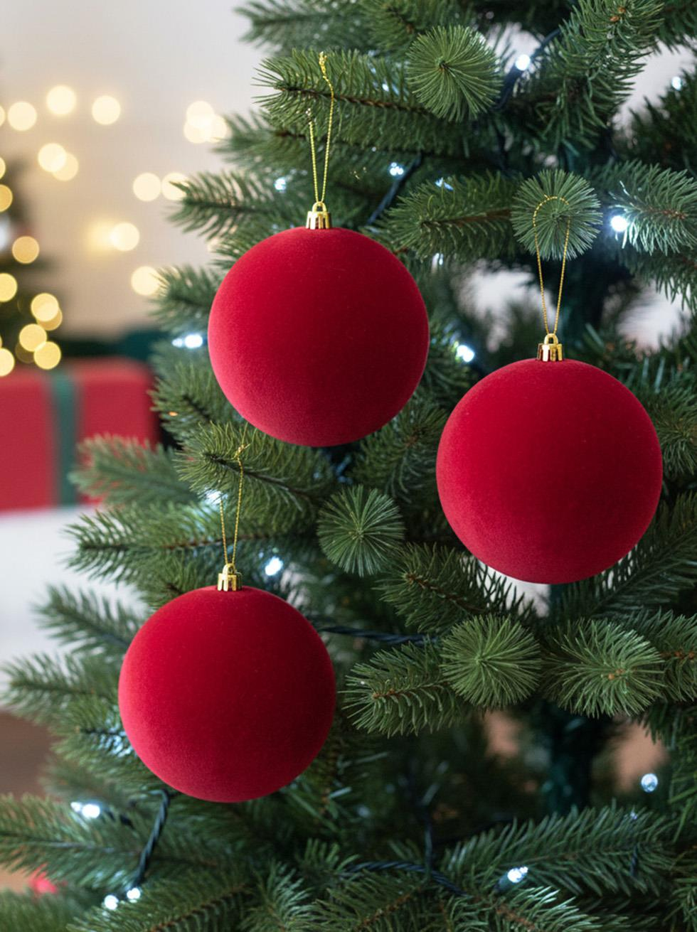 Zarif dokusuyla öne çıkan kadife yılbaşı topu, bordo rengi ve yumuşak yüzeyiyle çam ağacınıza sıcak ve lüks bir hava katar.
