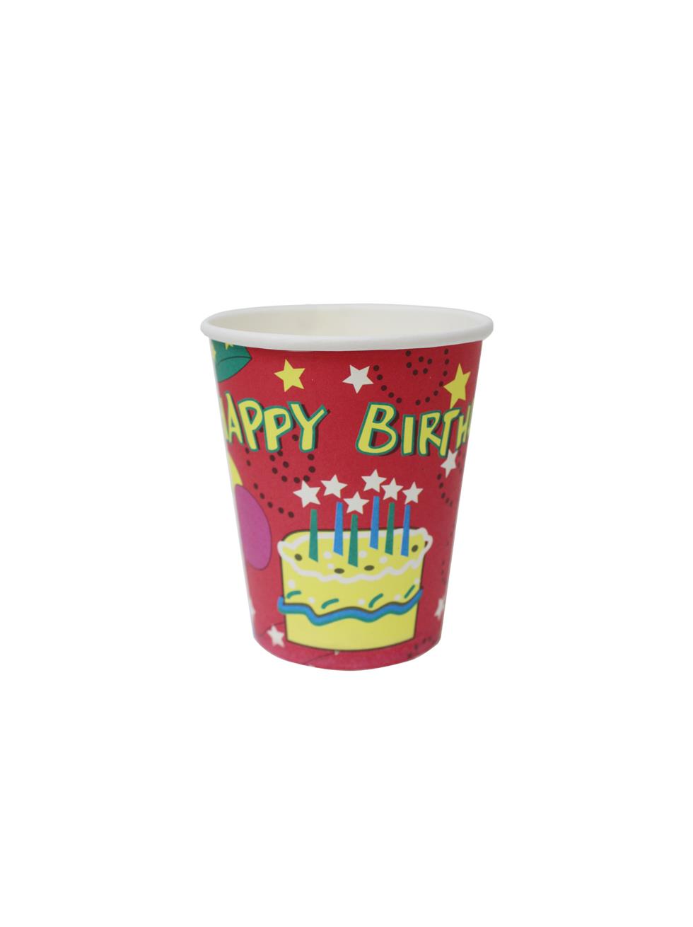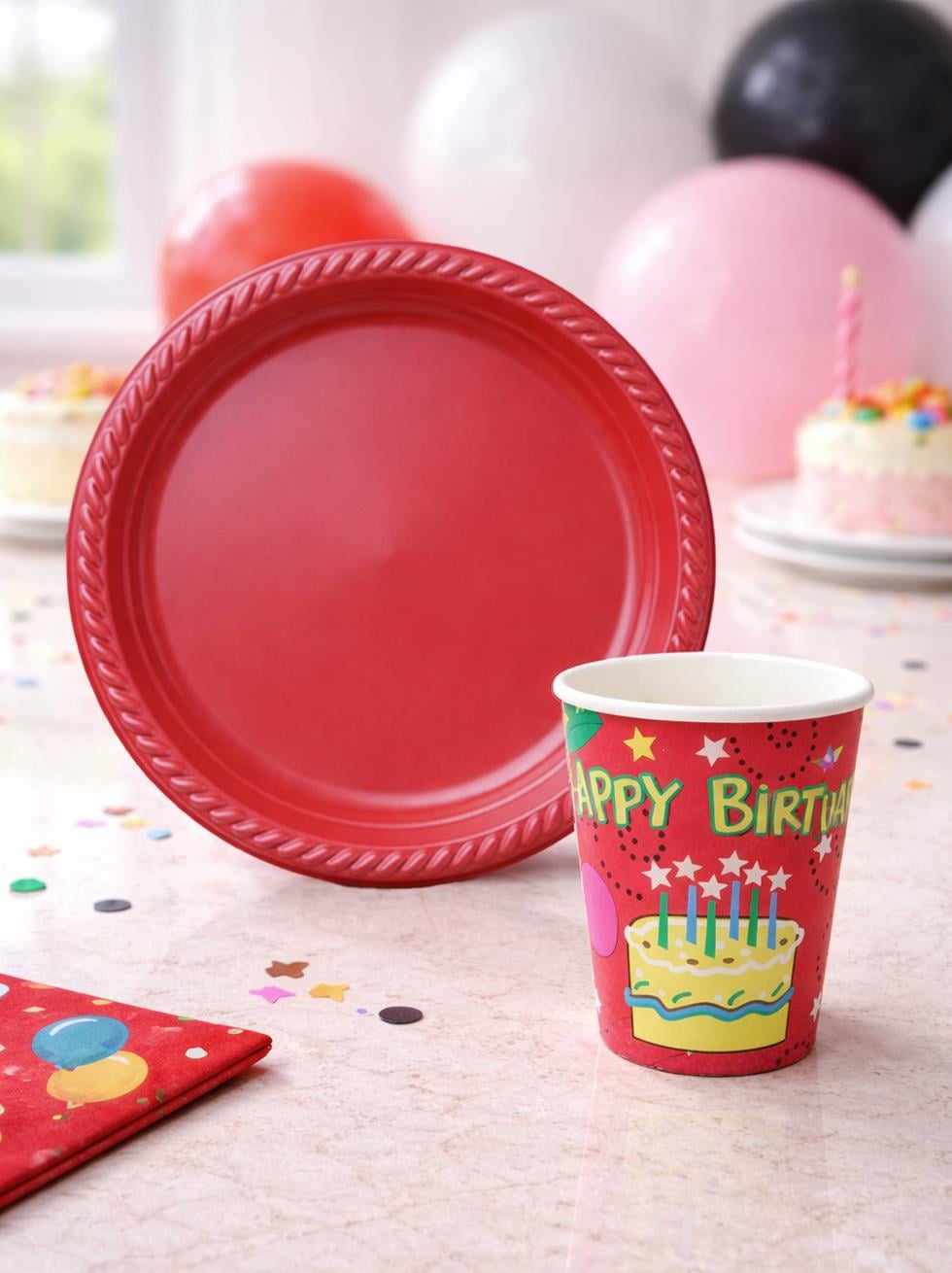 Canlı kırmızı renkli tabak ve üzerinde “Happy Birthday” yazılı bardak ile konsept bütünlüğü sağlar.