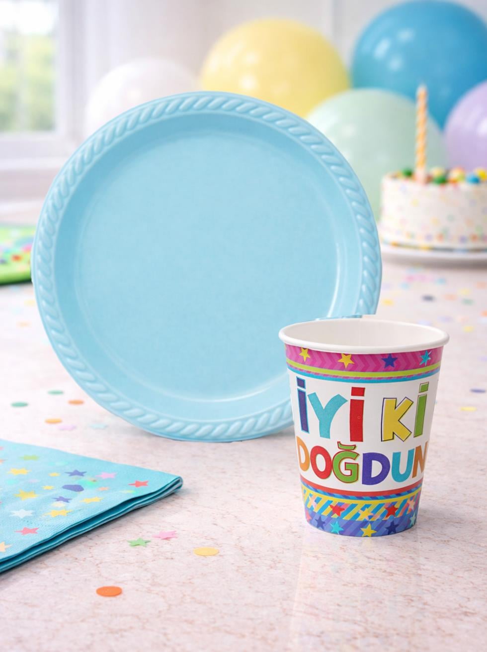 Mavi doğum günü tabak bardak seti, parti organizasyonlarınızda hem şık hem de pratik bir çözüm sunar.