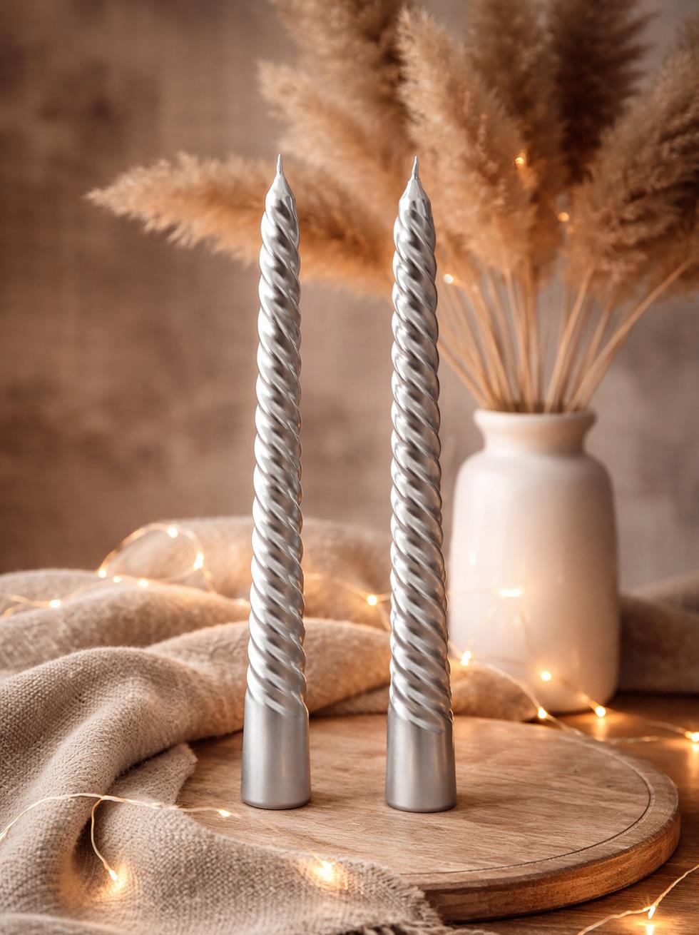 Metalik Gümüş Spiral Şamdan Mum – Şık Dekoratif Masa Dekoru