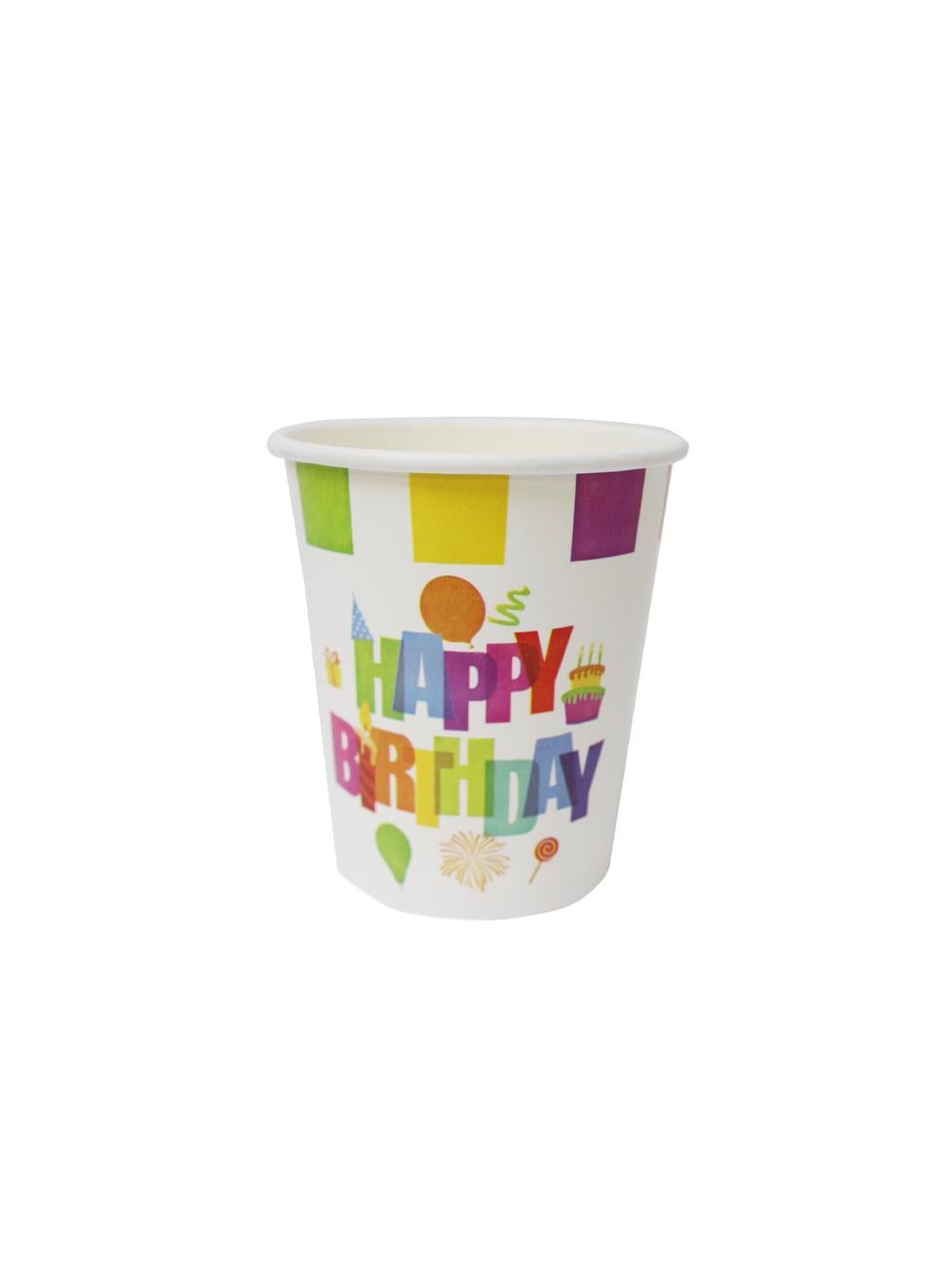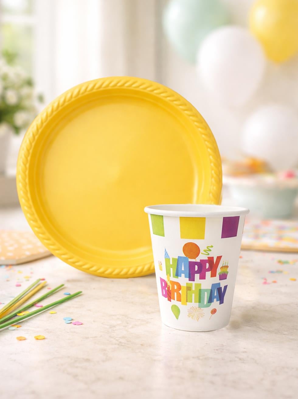 Canlı sarı renkli tabak ve üzerinde “Happy Birthday” yazılı bardak ile konsept bütünlüğü sağlar.