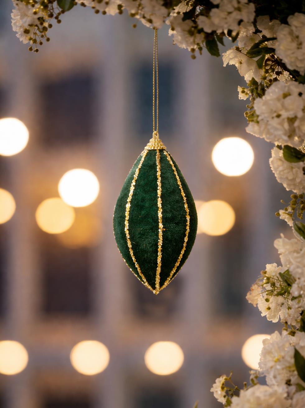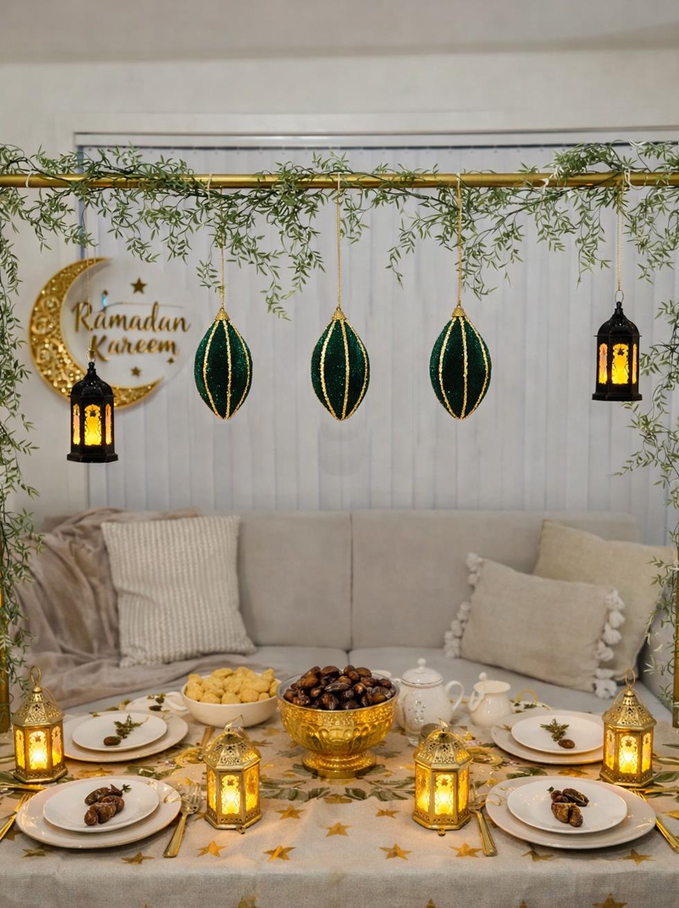 Ramazan ayının huzurlu atmosferini yansıtan kadife yeşil altın detaylı sarkıt süs, zarif tasarımıyla ev dekorasyonlarına şıklık katar.