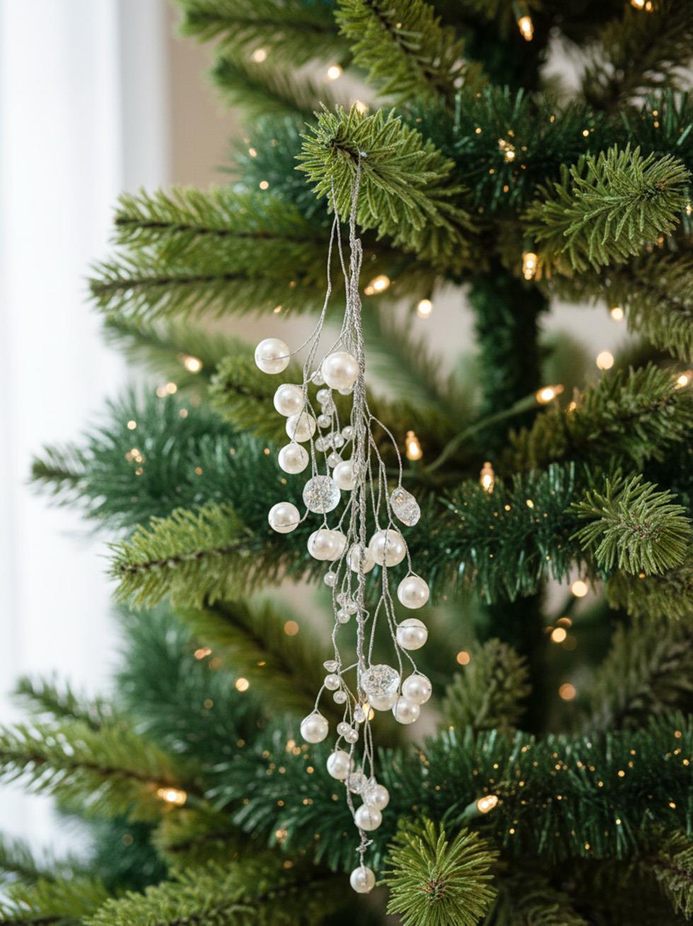 Lüks dokulu bu inci salkım süs, sade ama etkileyici yılbaşı dekorları arayanlar için mükemmel bir seçimdir.