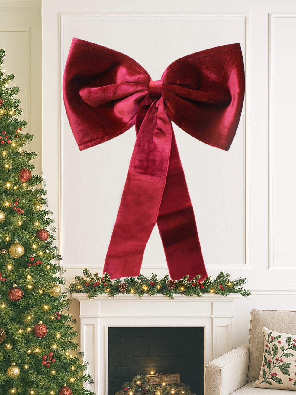 Bordo kadife büyük boy yılbaşı fiyonk, 75x105 cm ölçüsüyle evinize şıklık ve gösteriş getirir. Kapı ve duvar süslemelerinde göz alıcı bir dekor.