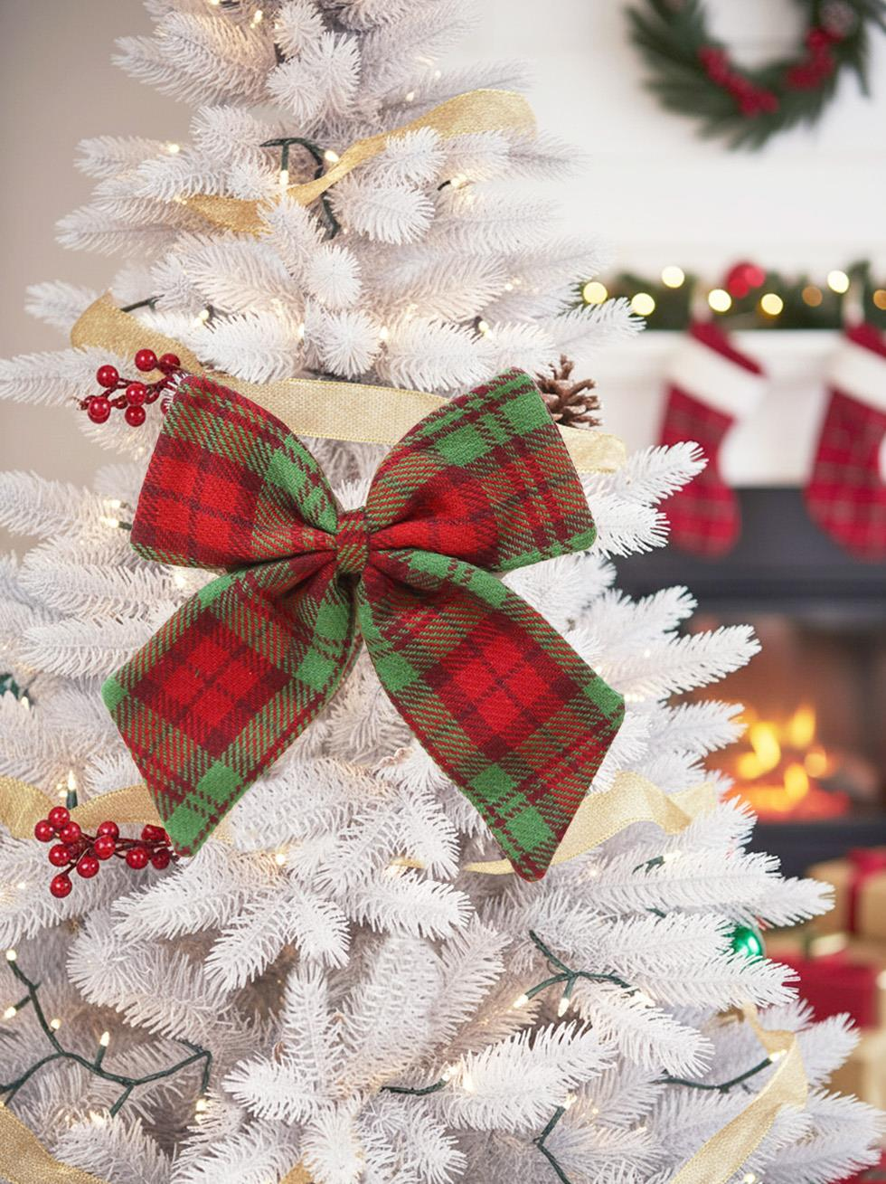 Kırmızı ve yeşil ekose deseniyle yılbaşı ruhunu yansıtan şık fiyonk süs. Kapı, duvar, hediye paketleri veya yılbaşı ağacı süslemelerinde kullanabilirsiniz.