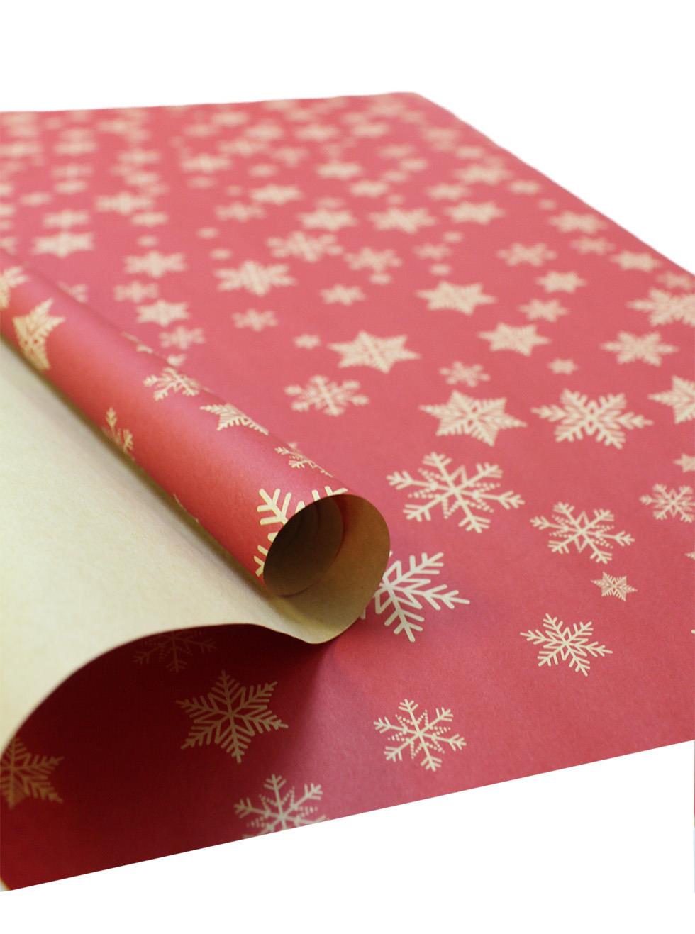 Kırmızı zeminli altın kar tanesi desenli hediye paketleme kağıdı, yılbaşı hediyelerinize şık ve zarif bir görünüm kazandırır.