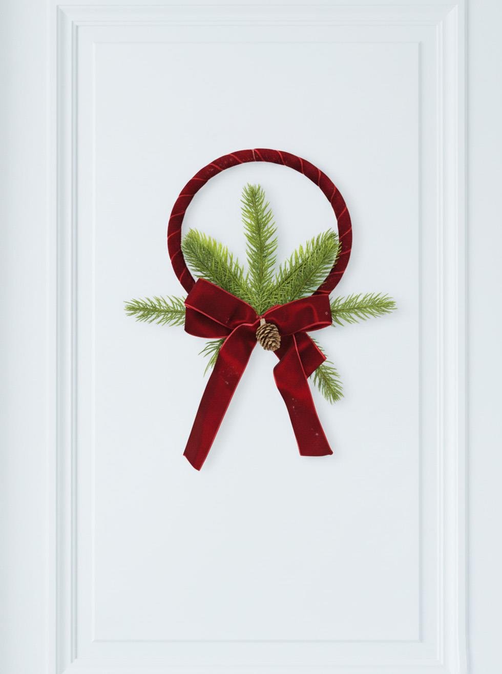 Sade ama etkileyici tasarımıyla yılbaşı ruhunu zarif bir şekilde yansıtan bu kadife kurdeleli kapı süsü, çam dallarıyla tamamlanmıştır.